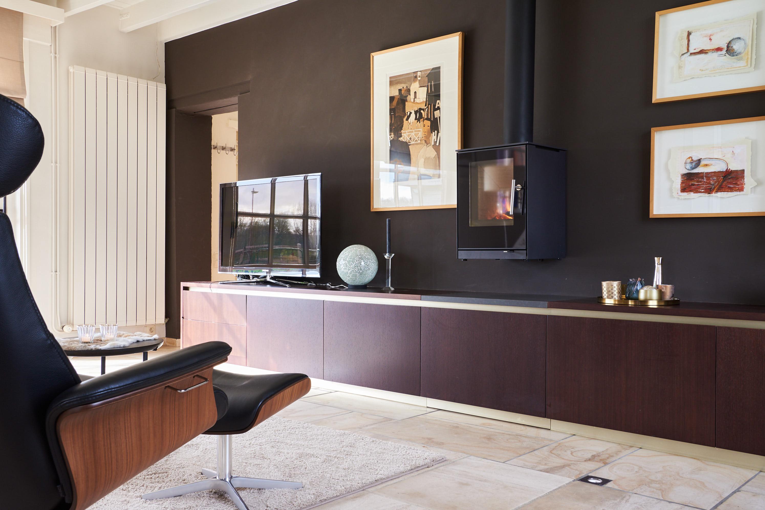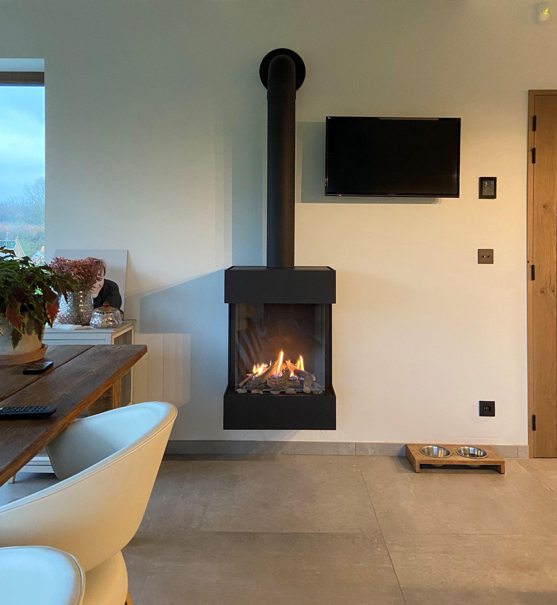 Wil je zo weinig mogelijk ruimte in beslag nemen, dan is een hangende haard een ideale oplossing. Op die manier creëer je een strak wandmeubel met beperkt ruimte verlies. De ruimte onder de hanghaard is ook steeds vrij, dit geeft ook een ruimer gevoel.