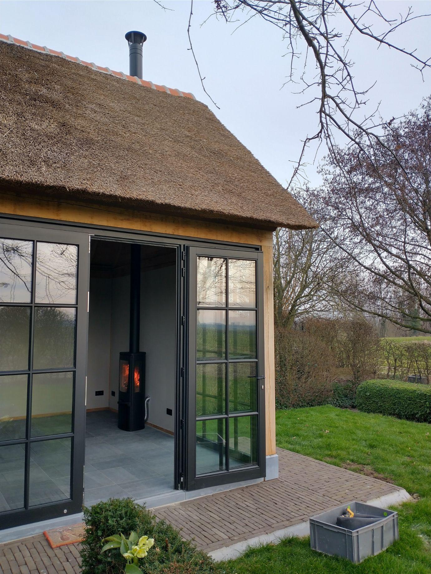 De tuinkamer moet een gezellige temperatuur hebben, daarvoor koos de klant voor de bijverwarming met een houtkachel.