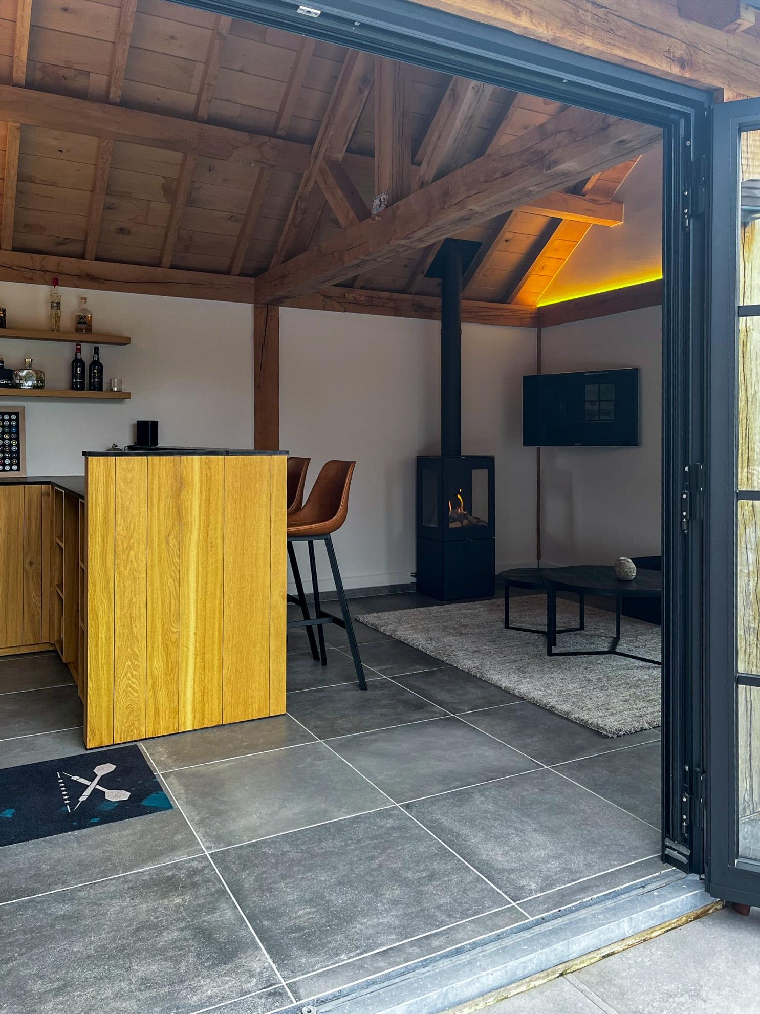 Een buitenhaard kon in deze tuinkamer niet ontbreken, de warmte is er echt wel nodig als er reeds van de tuin genoten kanl worden vanaf april tot in oktober. Gezellig genieten van het haardvuur op gas tijdens de apero met vrienden en familie.