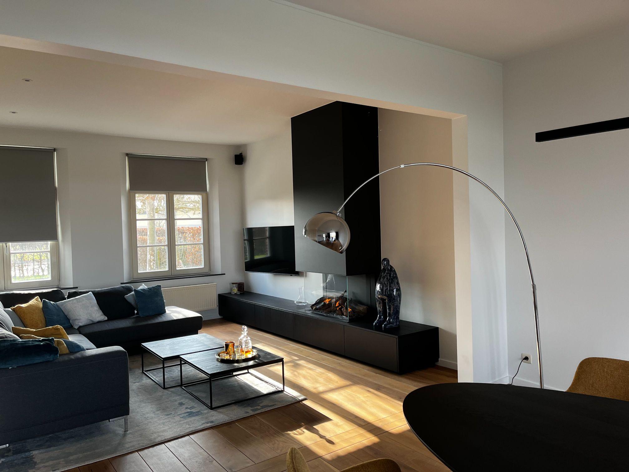 Een gashaard was niet mogelijk, maar de klant wist niet dat een elektrische haard er ZO ECHT kon uitzien. De keuze voor de elektrische sfeerhaard viel dus voor de waterdamphaard van faber haarden. Voor de haardwand werd er gekozen om de sokkel in een contrast kleur te zoeken in het fineerhout tegenover het parket.