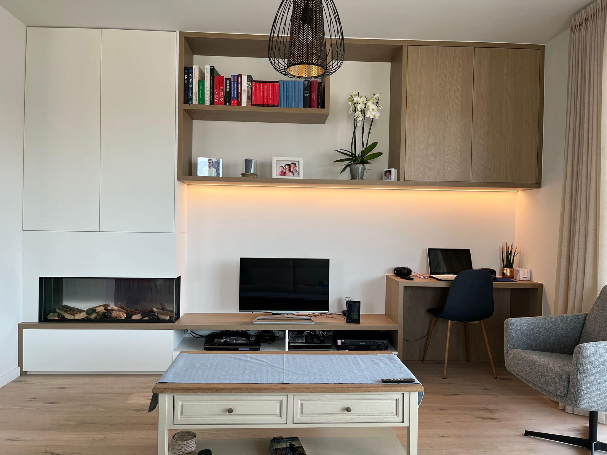 Fuunctionele haardwand met ingewerkte bureauruimte. Elektrische haard Dimplex, afgewerkt in laminaat en fineer.