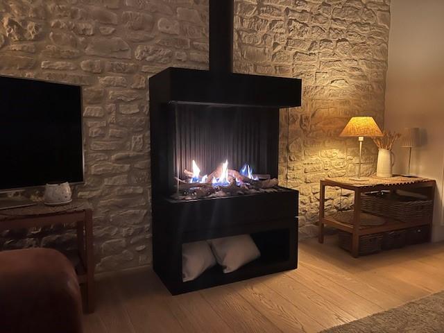 Gas kachel als extra sfeerverwarming in appartement. Hoekkachel Babrbas Box zoat vlam vanuit de volleidge leefruimte zichtbaar is.