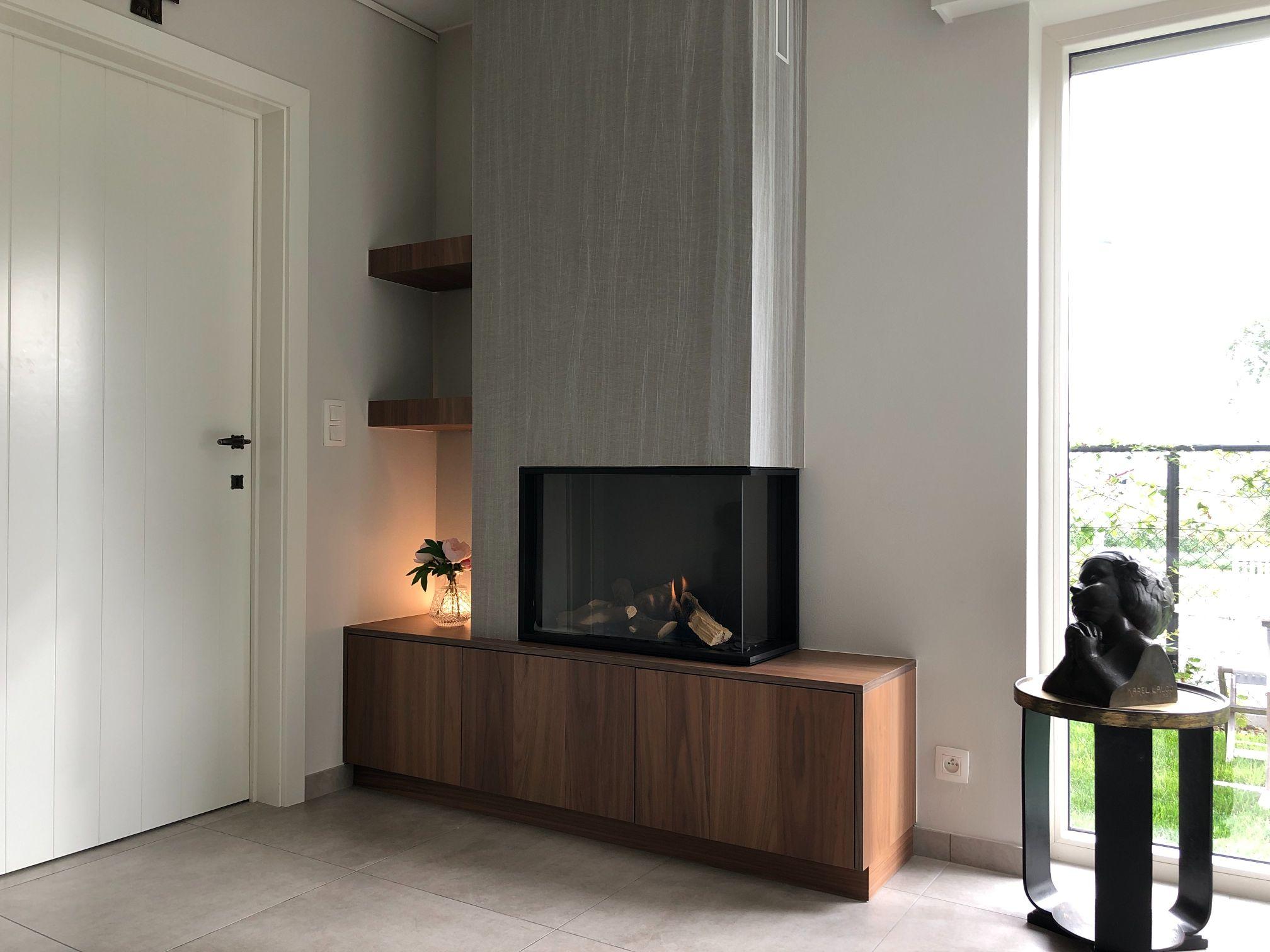 Op deze compacte muur erd gekozen om een kleine hoekhaard te plaatsen, voorzien van een decoratieve nis en afgewerkt onderaan met Fineer eik.