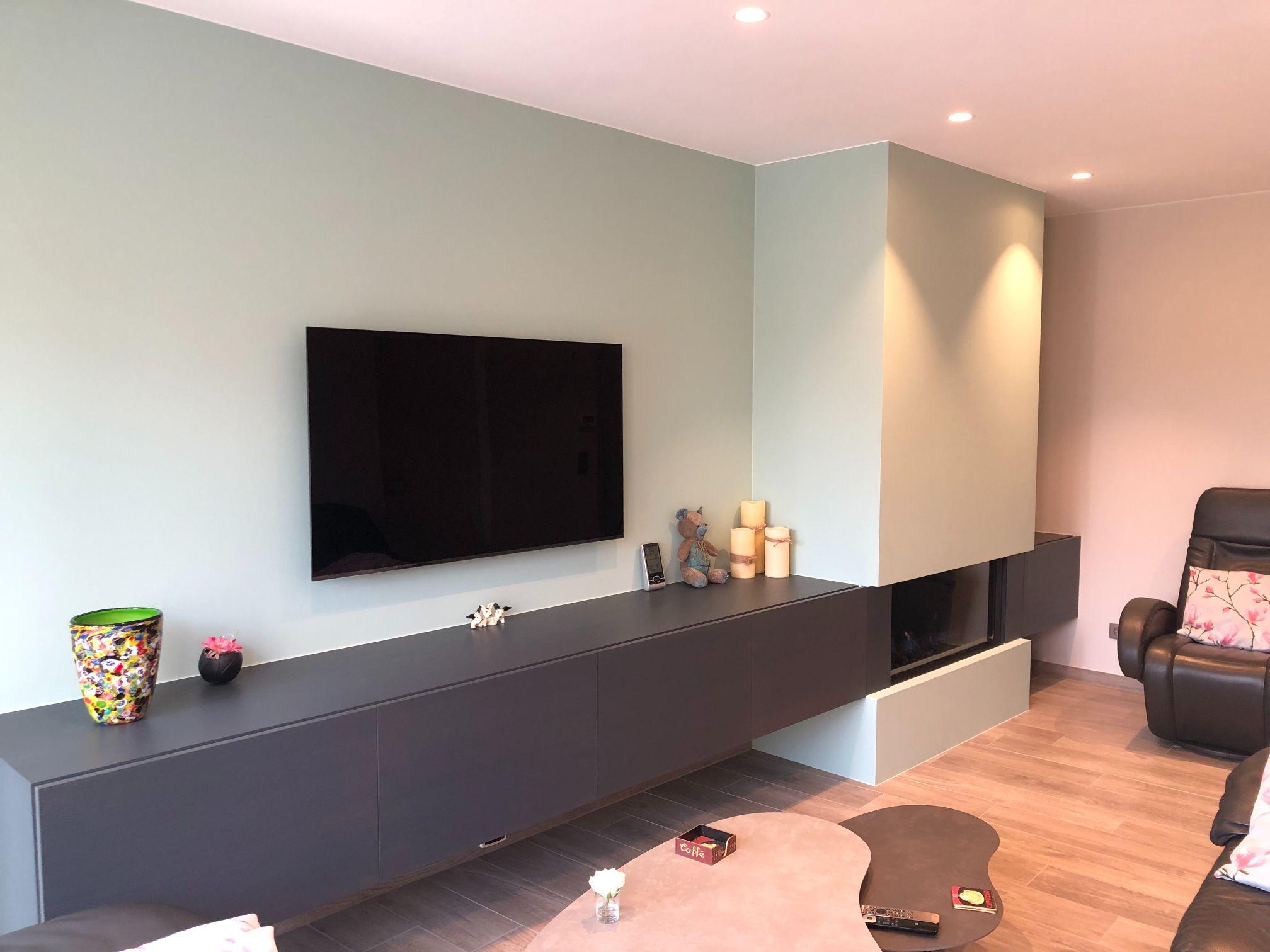 Bij het ontwerp van deze haardwand werd samen met de klant beslist om de zwevende kast, als uitlenging van de gas inbouwhaard, af te werken in donker fineer.