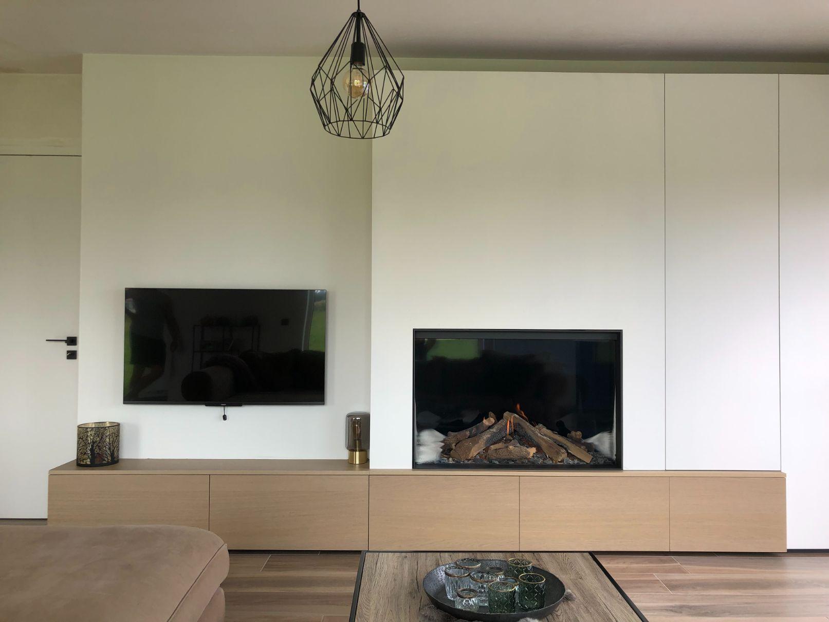 Bij deze gashaard werd gekozen om het ontwerp van de haardwand warm en cosy te houden. De haardwand is voorzien van heel wat opbergruimte en onderaan werd de sokkelkast afgewerkt in fineer eik.
