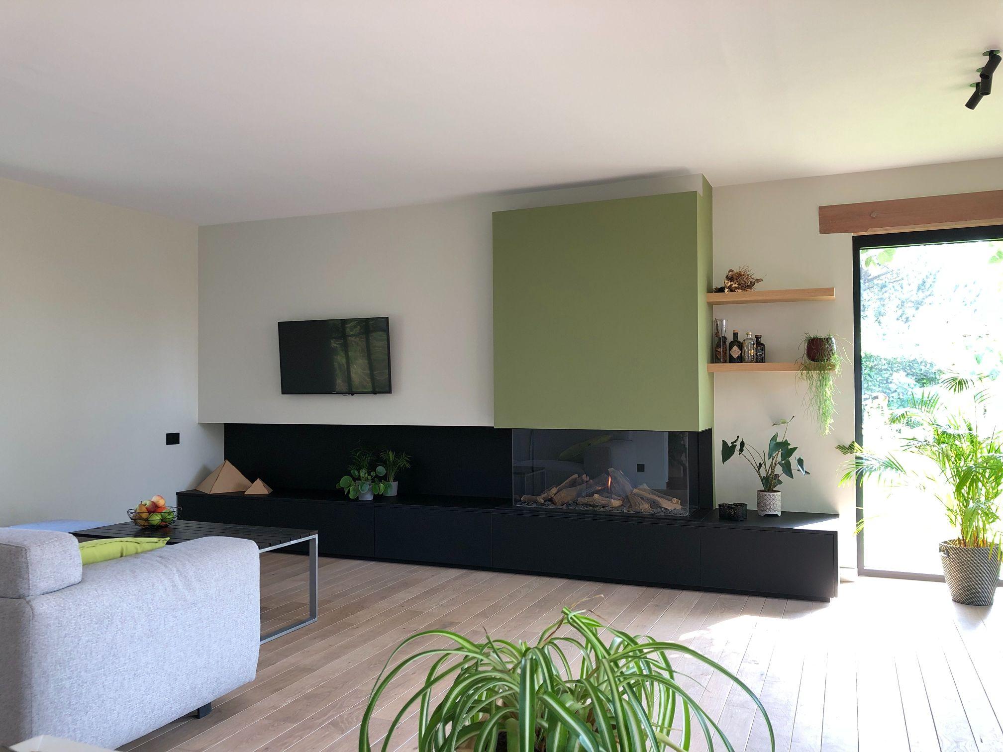 De haardwand met dubbele hoekhaard op gas van Faber haarden werd voorzien in een ruimte haardwand met tv. De kasten onderaan de gashaard werden uitgevoerd in HPL, krasbestendig materiaal alsook de uitlenging naast de haard.