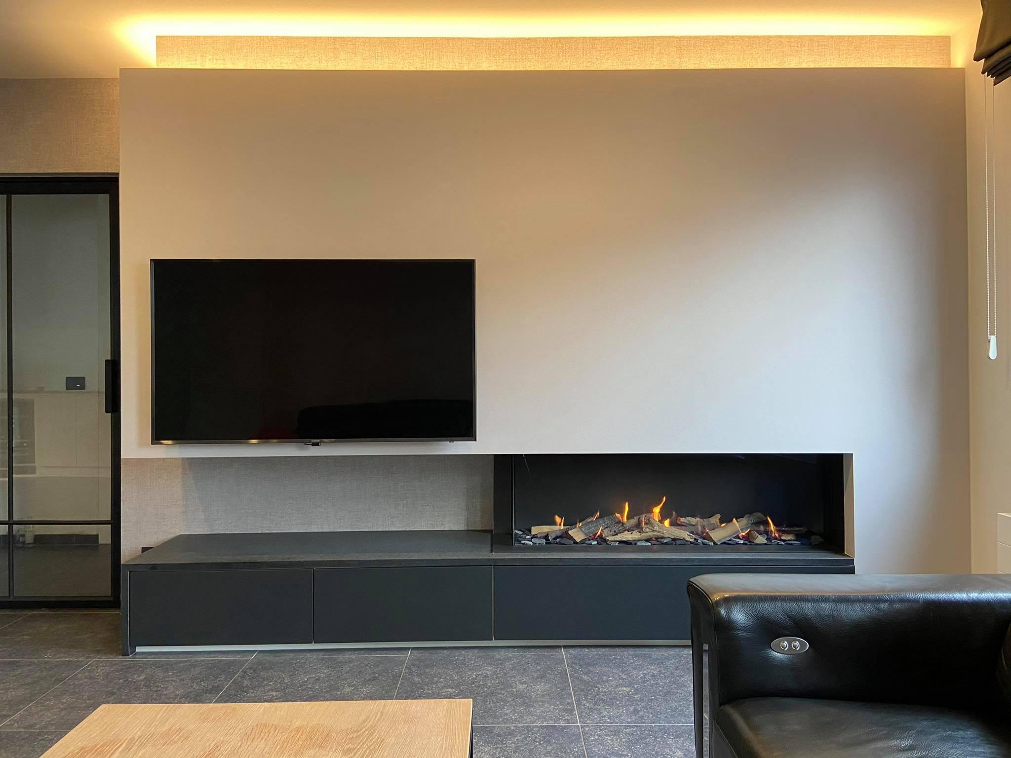 Voor dit wandmeubel met haard en tv hebben we samen met de klant gekozen voor de hoekkachel van Faber haarden. De haardwand kreeg een afwerking onderaan in natuursteen in combinatie met sokkelkasten. Er werd ook extra opberg ruimte voorzien aan de zijkant haard wand.