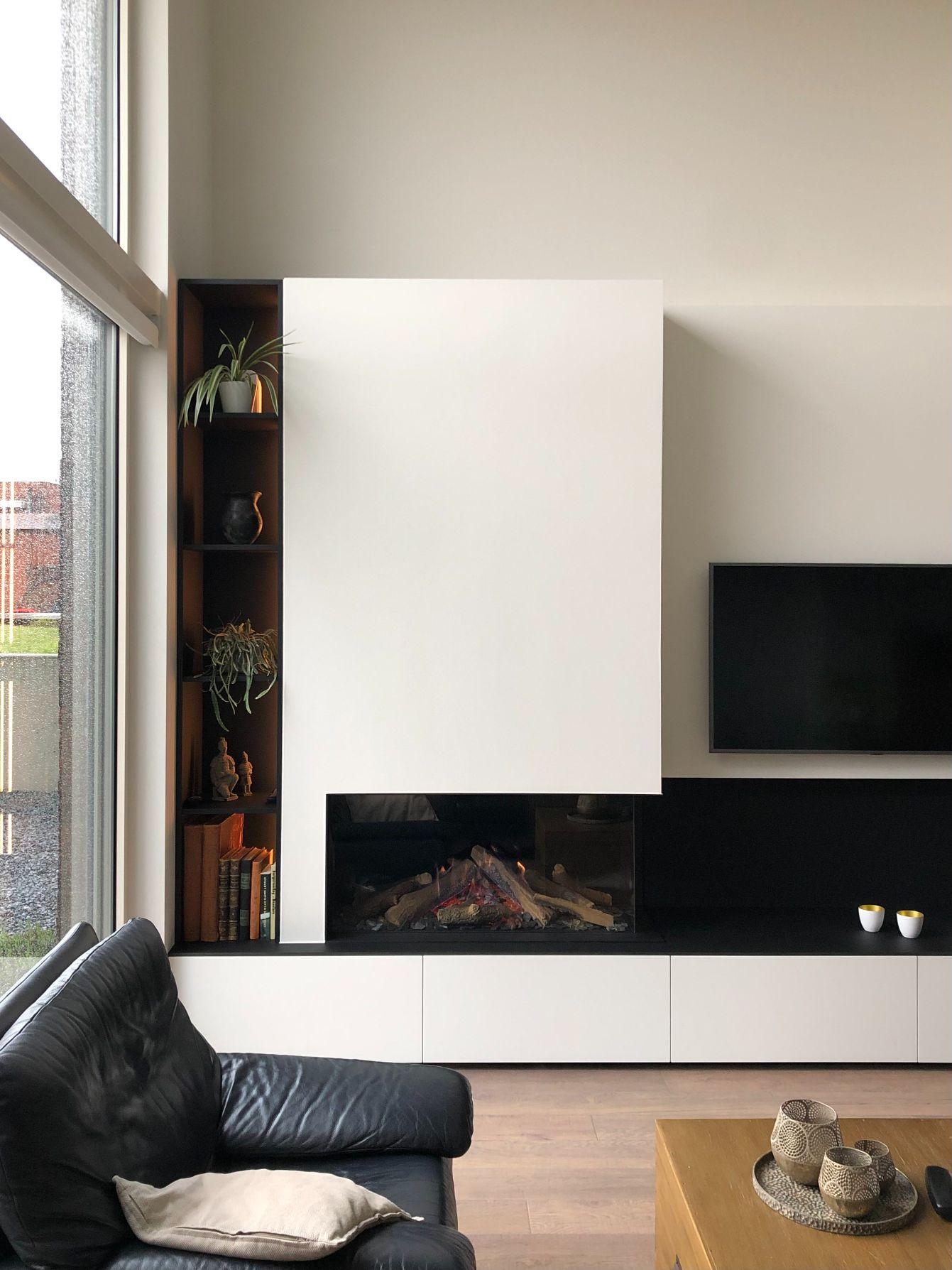 Hoekhaard op gas van het merk Faberhaarden werd geintegreerd in haardwand met TV. Materiaalkeuze van de haardwand: kleuren zwart wit, onderhoudsvriendelijk laminaat.