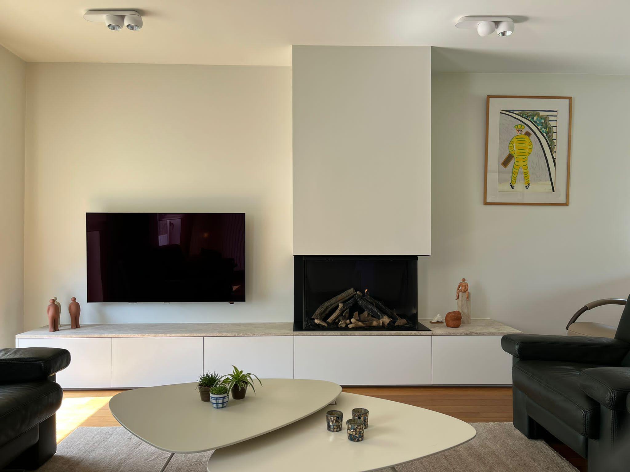De bestaande oude openhaard met inbouwcassette moest hier plaats maken voor een hoekkachel op gas. De M-design gashaard werd gekozen en de afwerking van de wand werd voorzien in een onderhoudsvriendelijk HPL, afgewerkt met een warm ogende natuursteen.