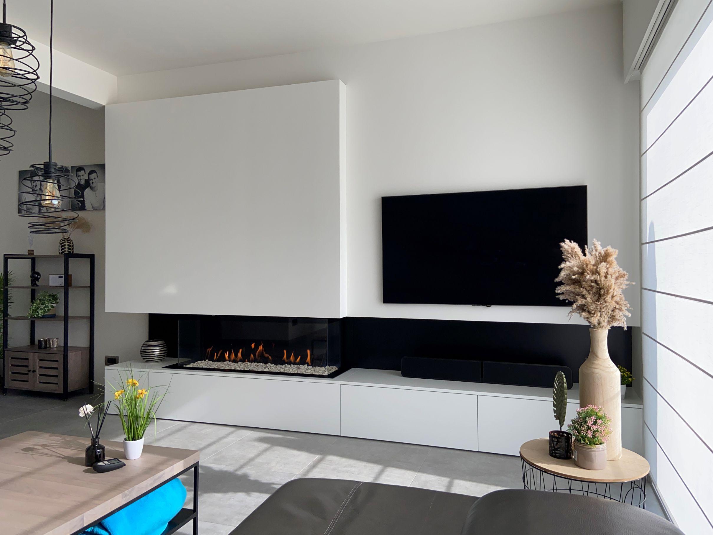 Bij aanvang koos de klant ervoor de gashaard te plaatsen waar de bestaande open haard was. Door het in 1 geheel brengen van keuken en woonkamer adviseerden we de klant de haard op een andere locatie te plaatsen. De haardwand, met sfeerhaard gas van M-design werd afgewerkt met kasten in lakwerk.