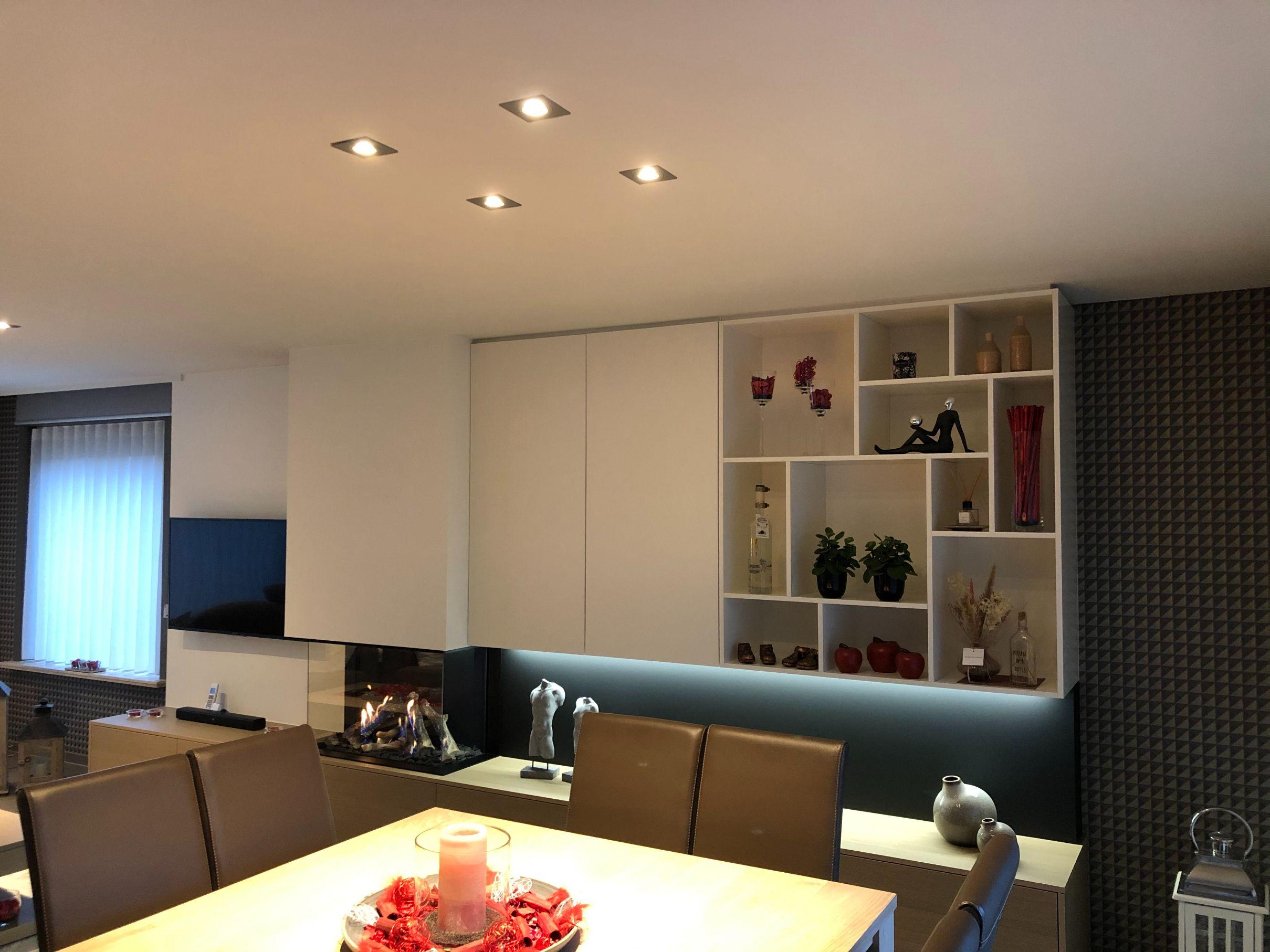 Deze haardwand werd centraal in de living geplaatst, het haardvuur op gas van Faber haarden is vanuit alle hoeken in de kamer te bewonderen. De combinatie met de sokkel in fineer en de decoratieve nis zorgt direct voor een afgewerkte haardwand.