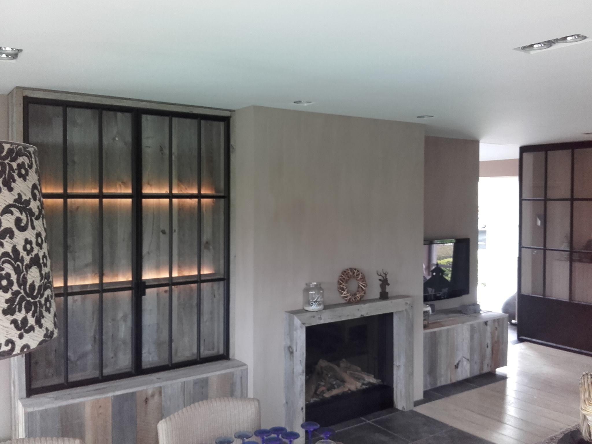 Samen met de klant kwam het ontwerp tot stand en werd er gekozen deze haardwand in barnwood af te werken in combinatie met stalen deuren. De gashaard werd hier voorzien van een sierschouw eveneens in barnwood.