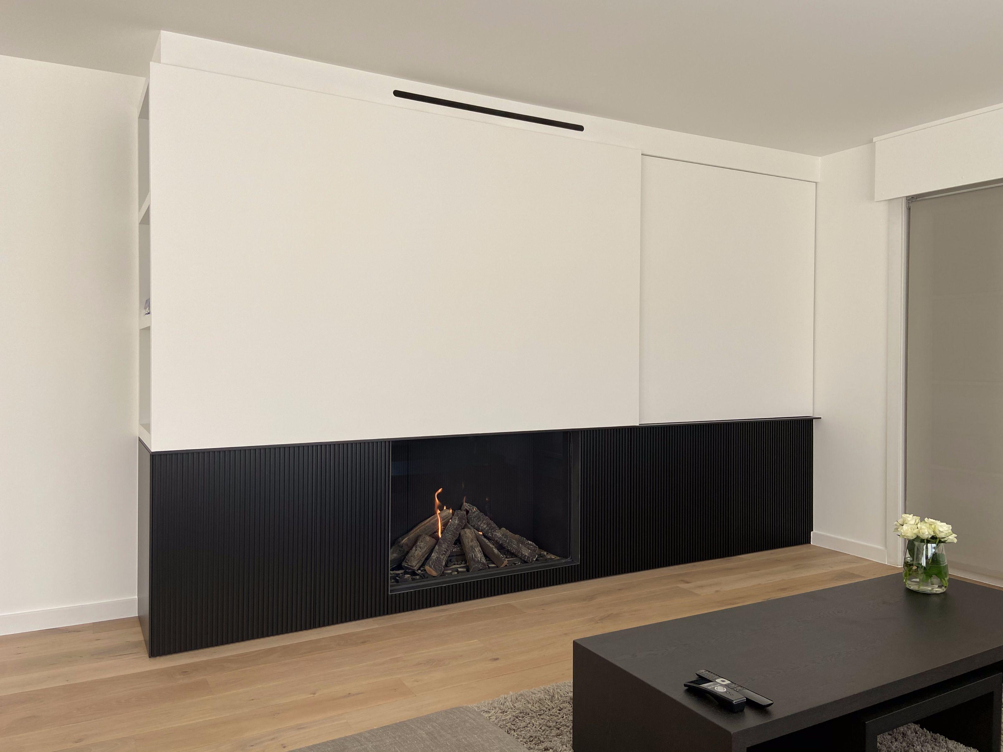 We kozen samen met de klant voor de Cosyflame incognito voor zijn natuurlijke look. De haardwand met tv schuiwand werd afgewerkt in lakwerk in combinatie met de geribte uitlenging naast de haard waar kastruimte is voorzien. De haardwand is aan de linkerzijde afgewerkt met een open nis.