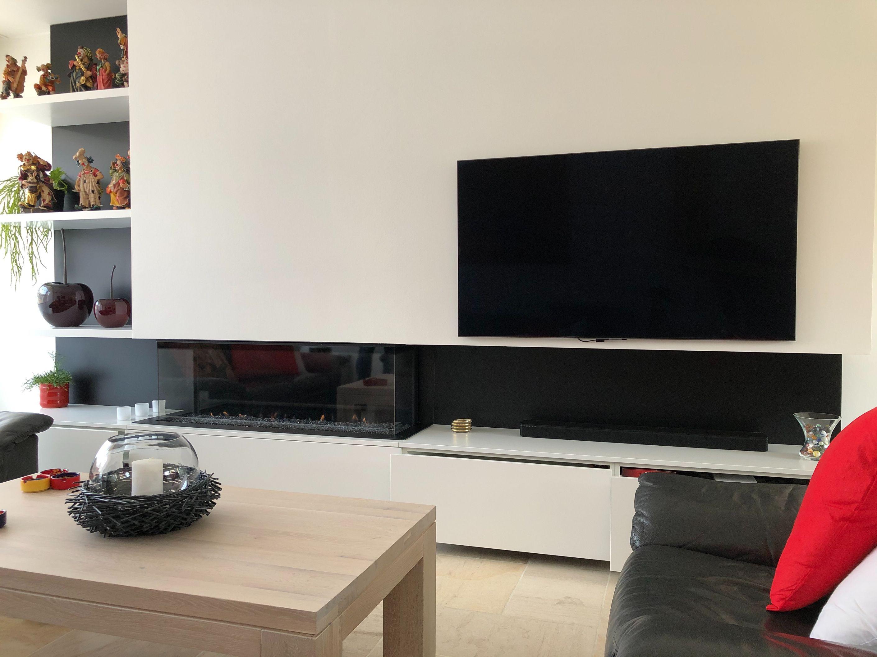 Voor deze haardwand met gashaard van M-design haarden werd gekozen om deze zeer onderhoudsvriendelijk te voorzien. We kozen om deze gedeeltelijk te voorzien in lakwerk in combinatie met de schilderwerken. Bij deze klant mochten we de volledig afbraak van de open haard voorzien tot de volledige afgewerkte geschilderede haardwand.