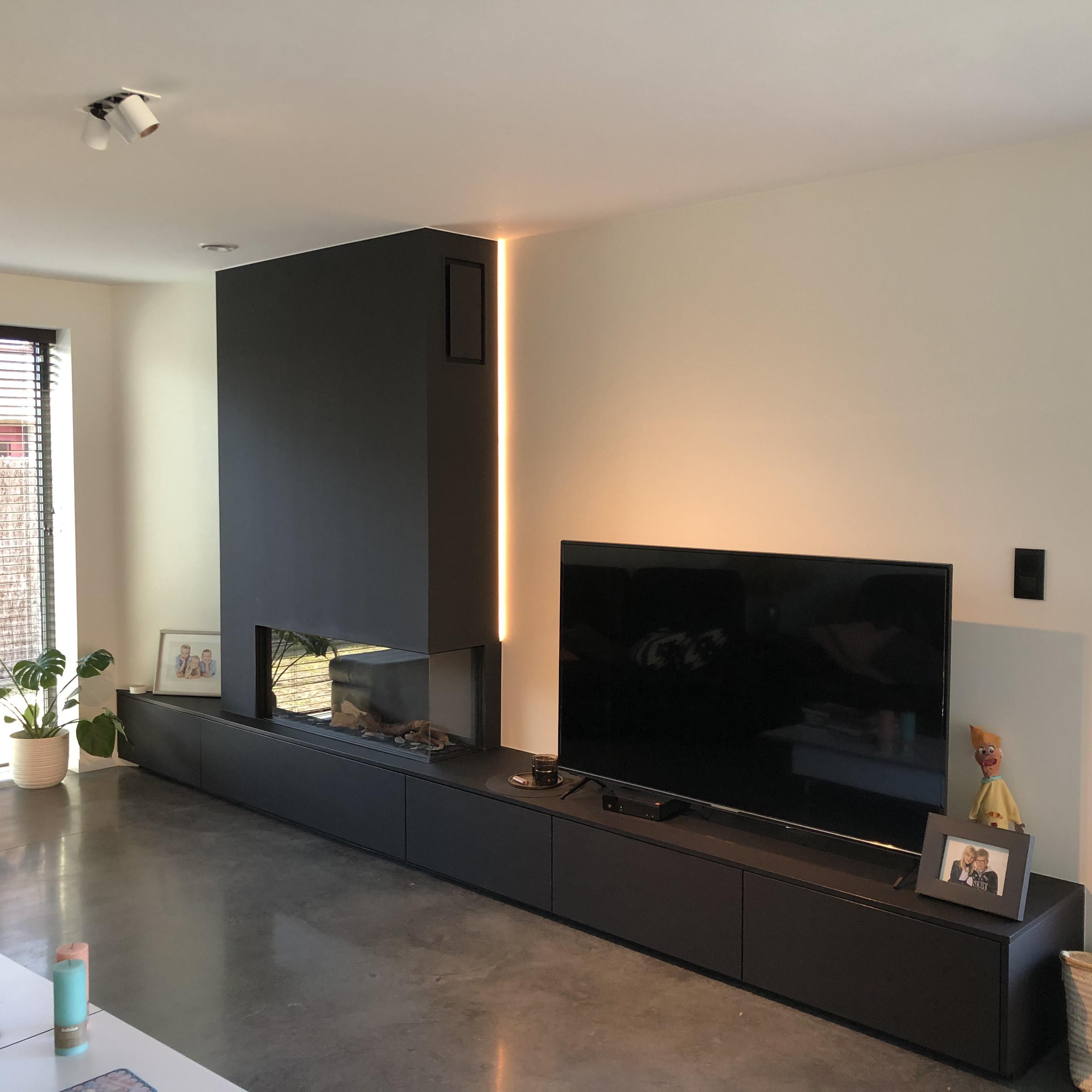 Deze haardwand met hoekhaard van Dru haarden is afgewerkt onderaan met het krasvrije laminaat HPL. Het gebruik van donkere kleuren bij deze wandhaard zorgt ervoor dat het vuur perfect tot zijn recht komt.