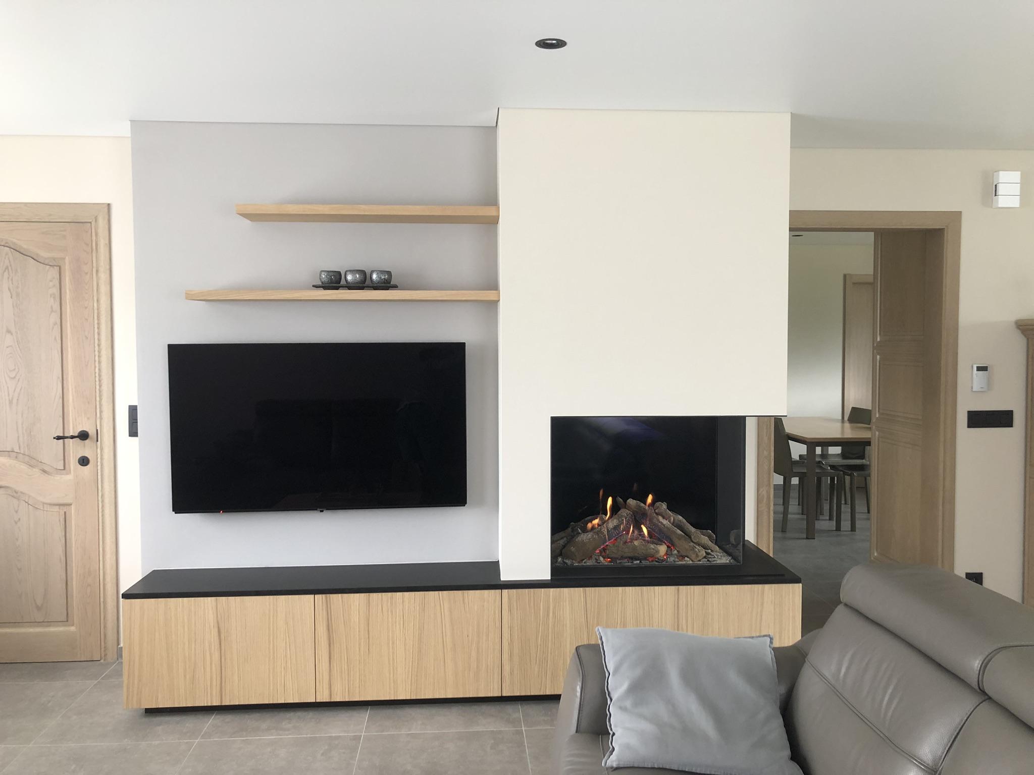 De hoekhaard op gas van Faber haarden mag hier deel uitmaken van de haardwand met tv, afgewerkt met sokkel in fineereik en tablet in graniet.